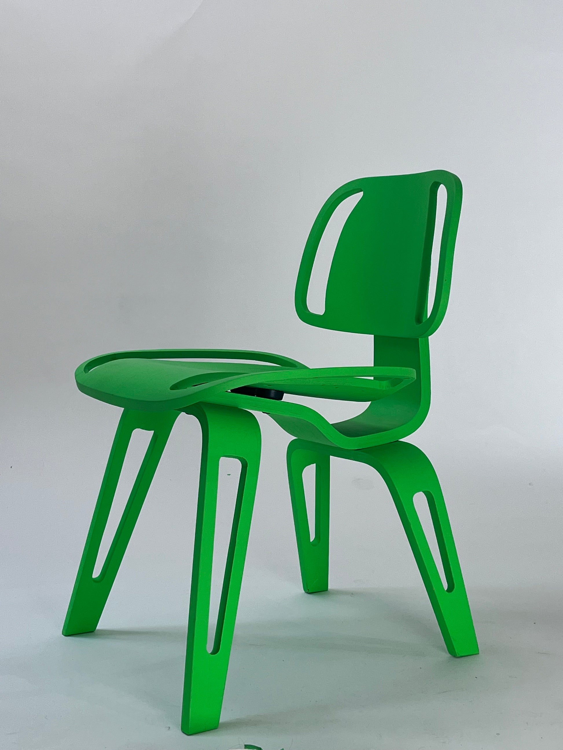This is a modification of a classic Eames DCW chair. Legacy piece made airy with a Neon Green Lacquer.